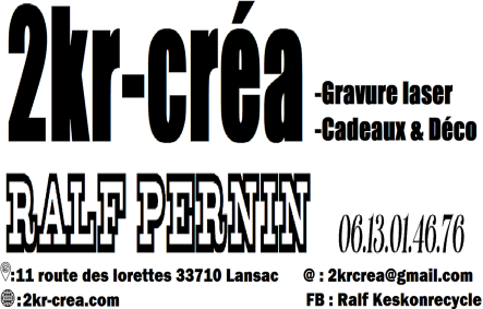 Contact 2kr-créaRaphaël Pernin 2krcrea@gmail.com 06 13 01 46 76 11 route des LorettesLansac, 33710France Facebook Télécharger la carte de visite virtuelle